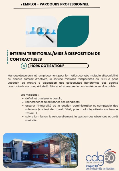Le service intérim territorial/mise à disposition de contractuels du CDG 60 a pour vocation de mettre à la disposition des collectivités adhérentes des agents contractuels (conformément à l’article 25 de la Loi n°84-53 du 26 janvier 1984).